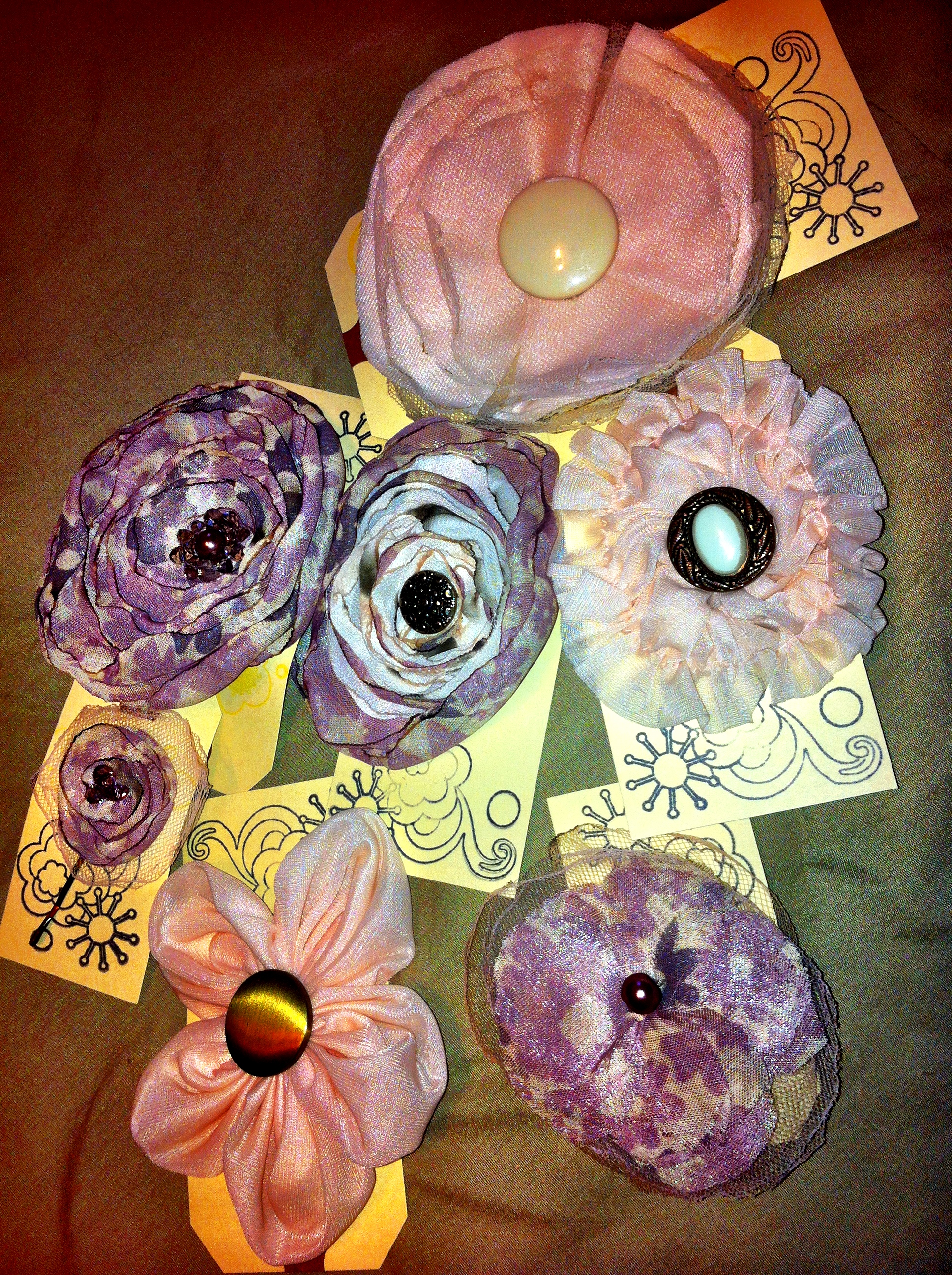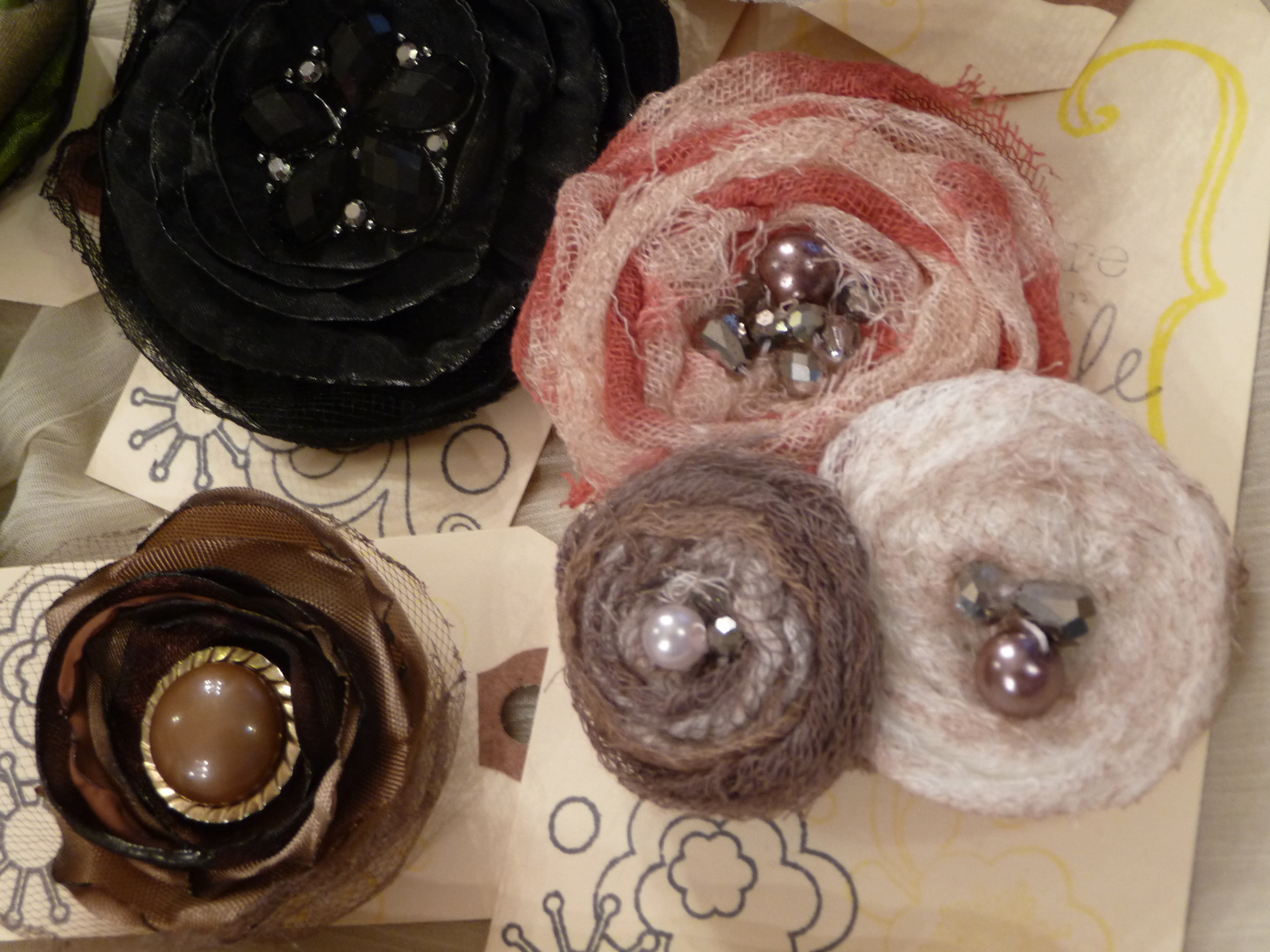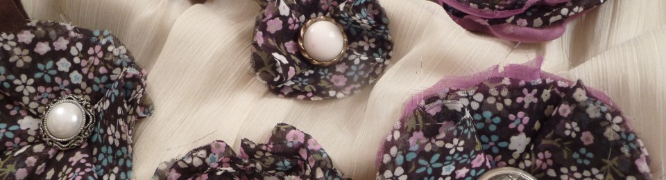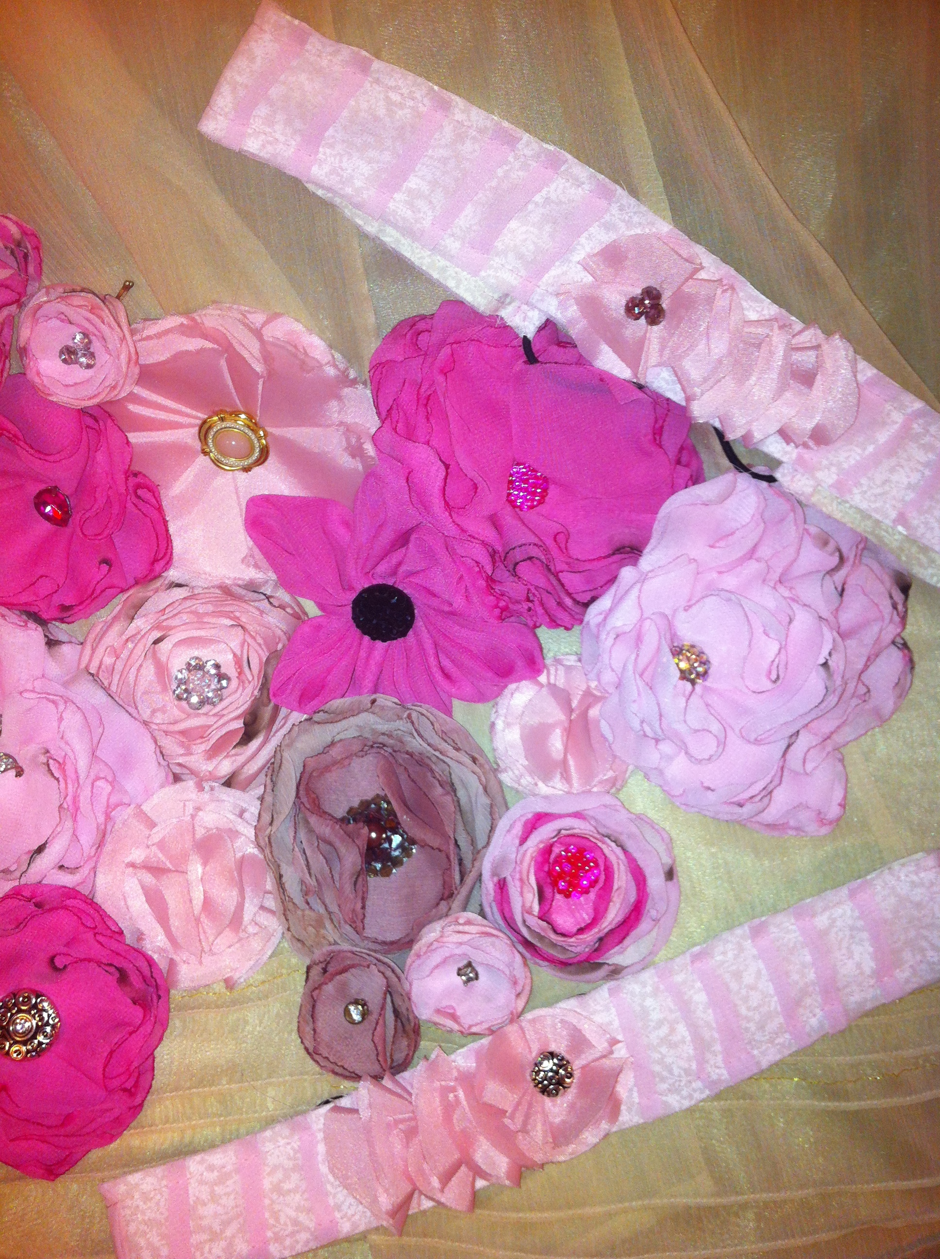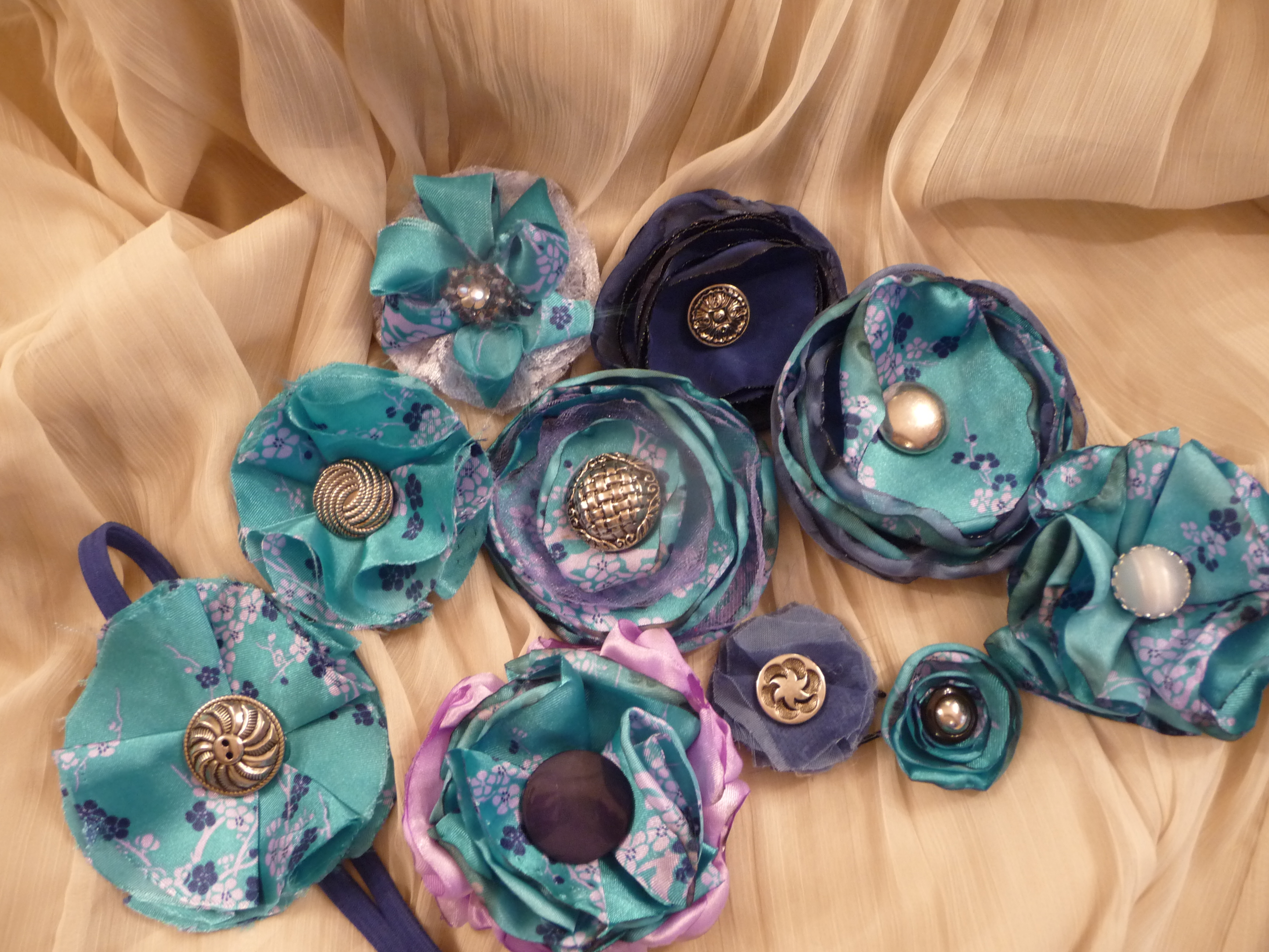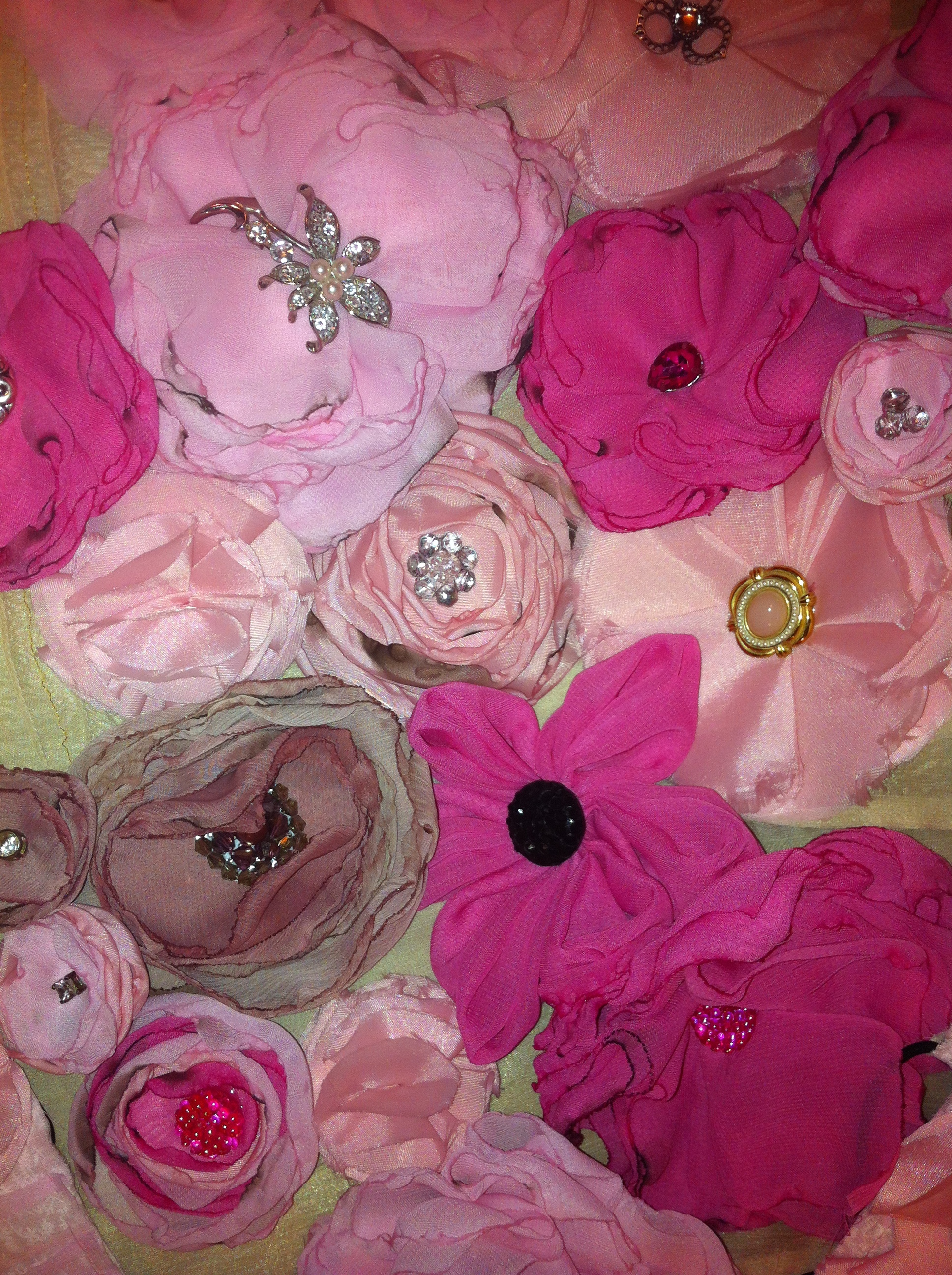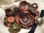 Fabric flowers created using many different fabrics and embellishments. Vintage jewelry, ribbons, feathers, buttons, felt and beads have been used.
