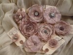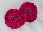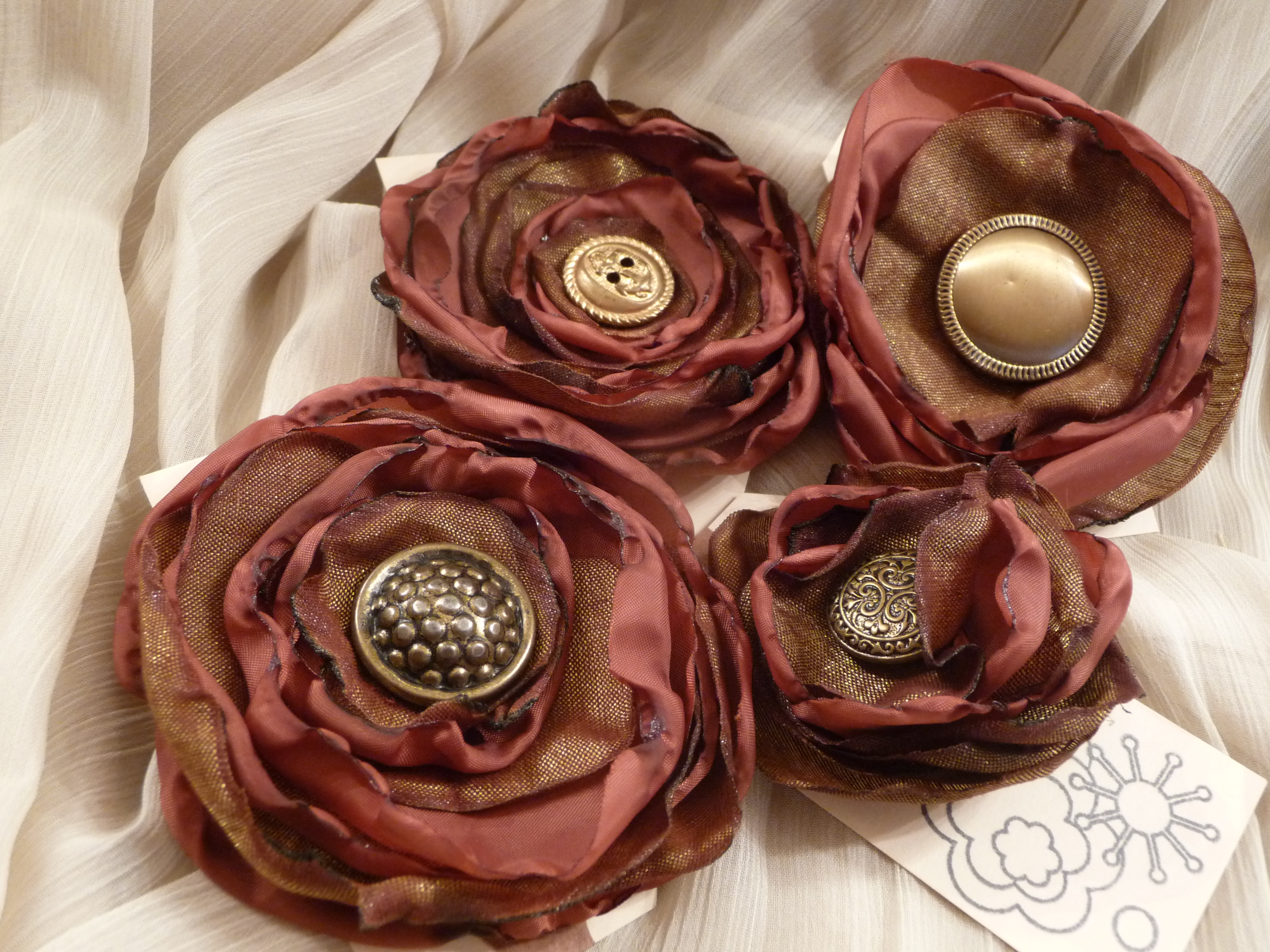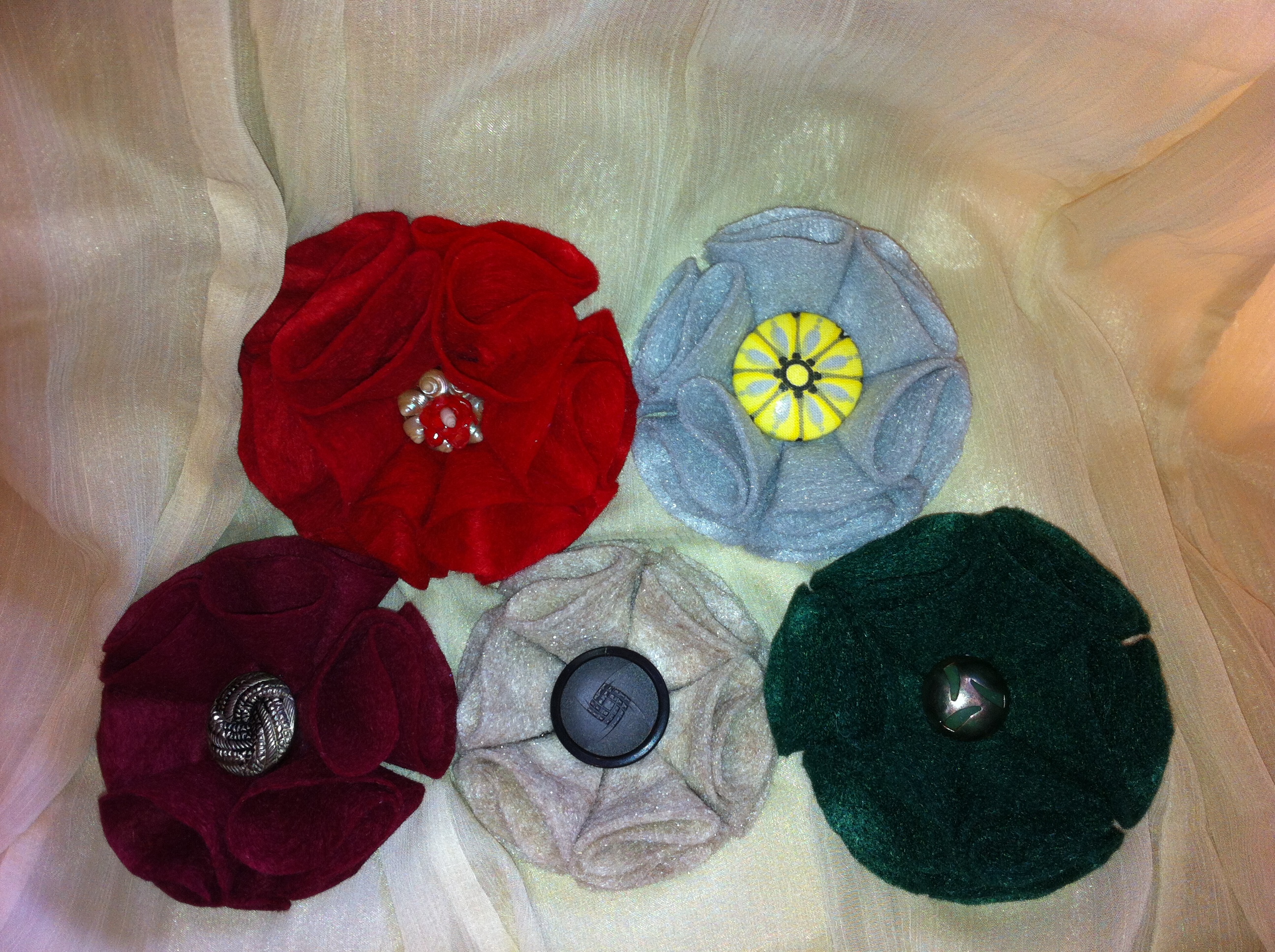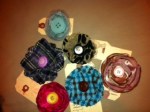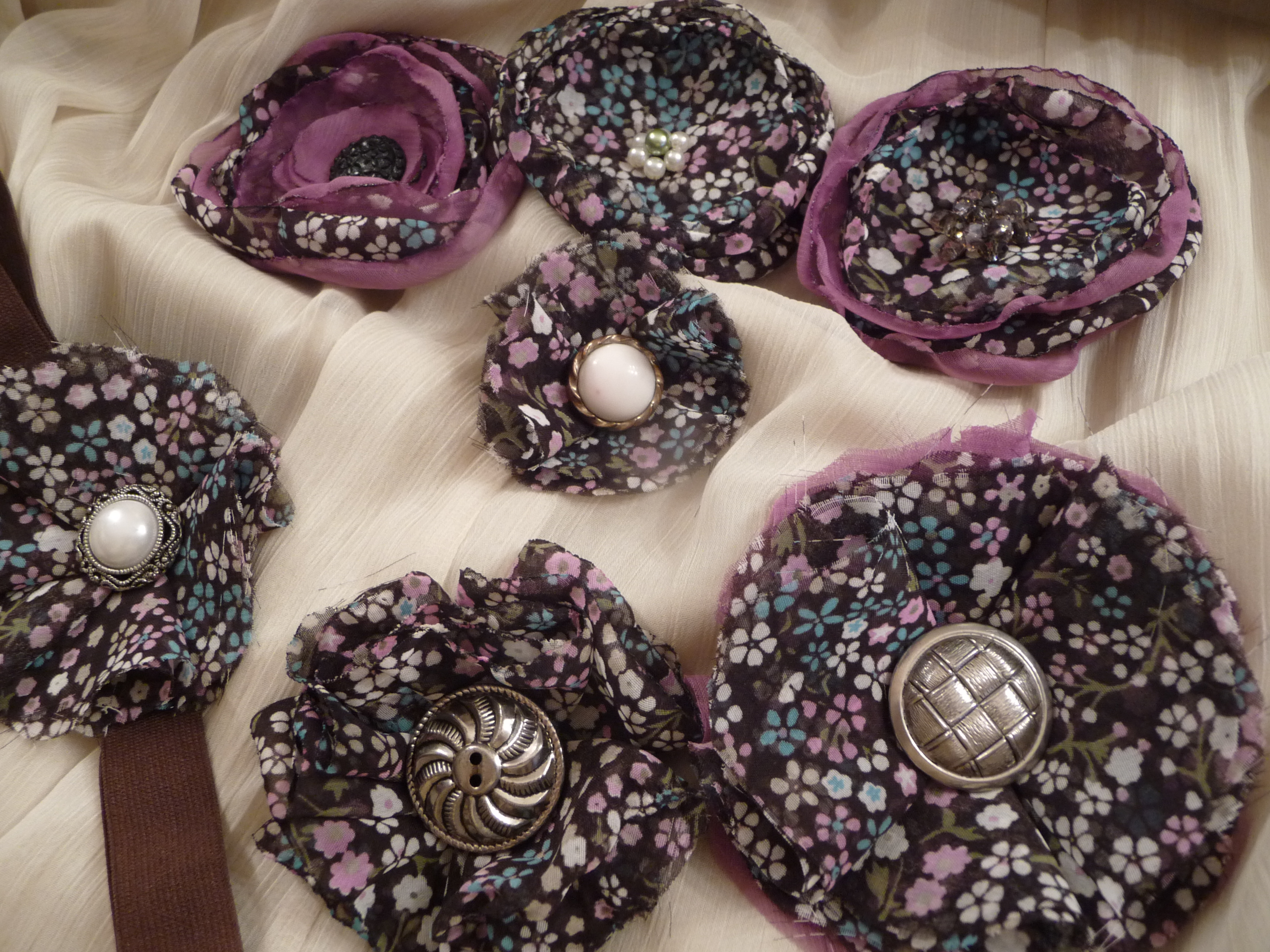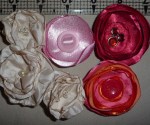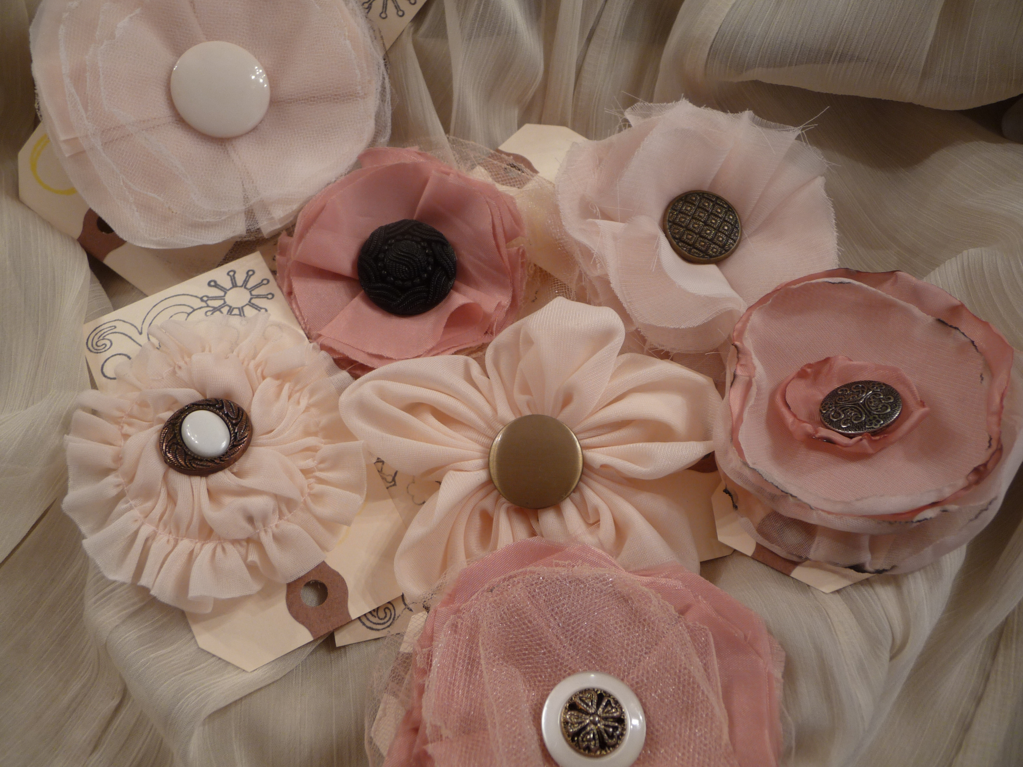 Fabric flowers created using many different fabrics and embellishments. Vintage jewelry, ribbons, feathers, buttons, felt and beads have been used.