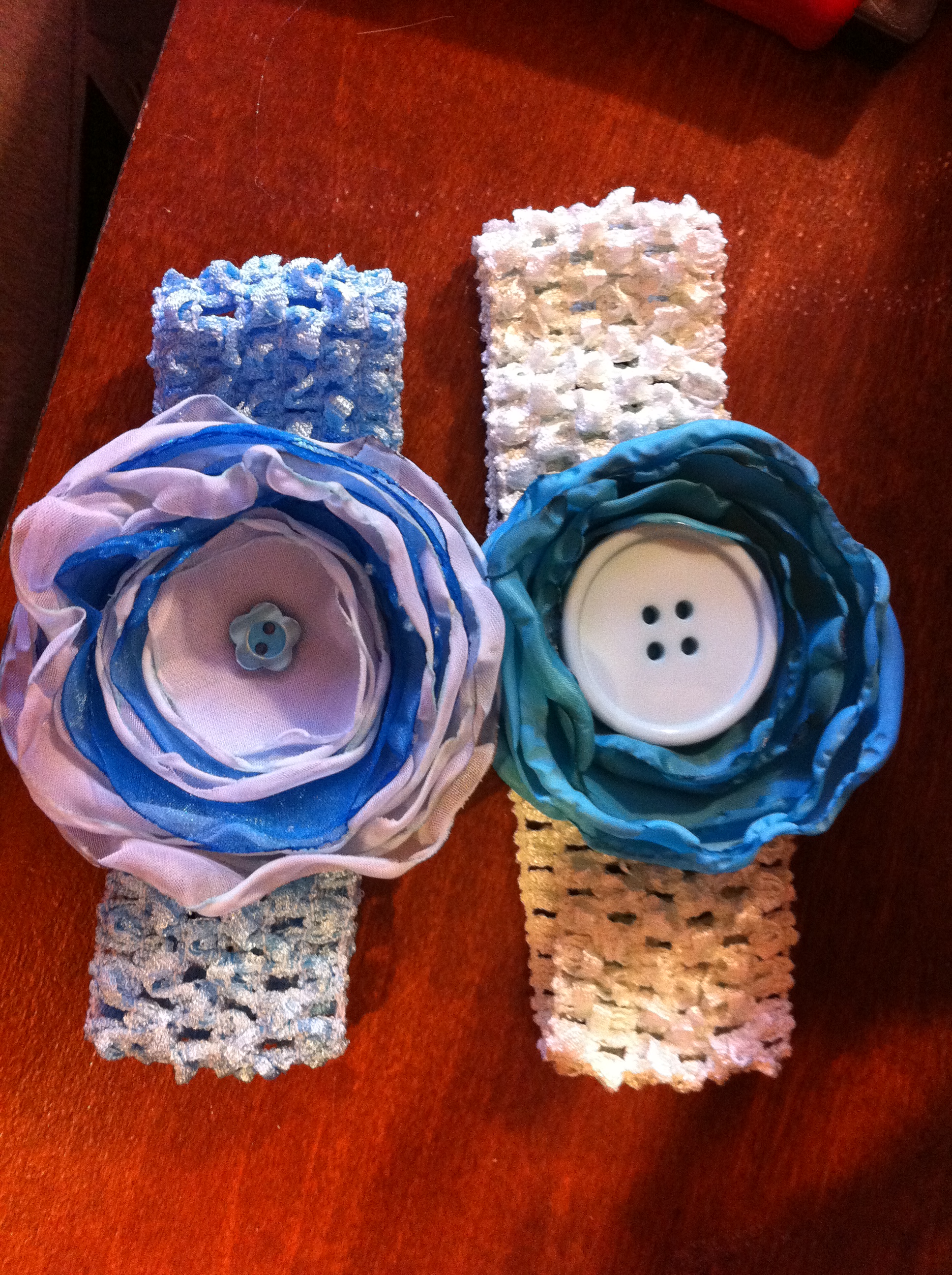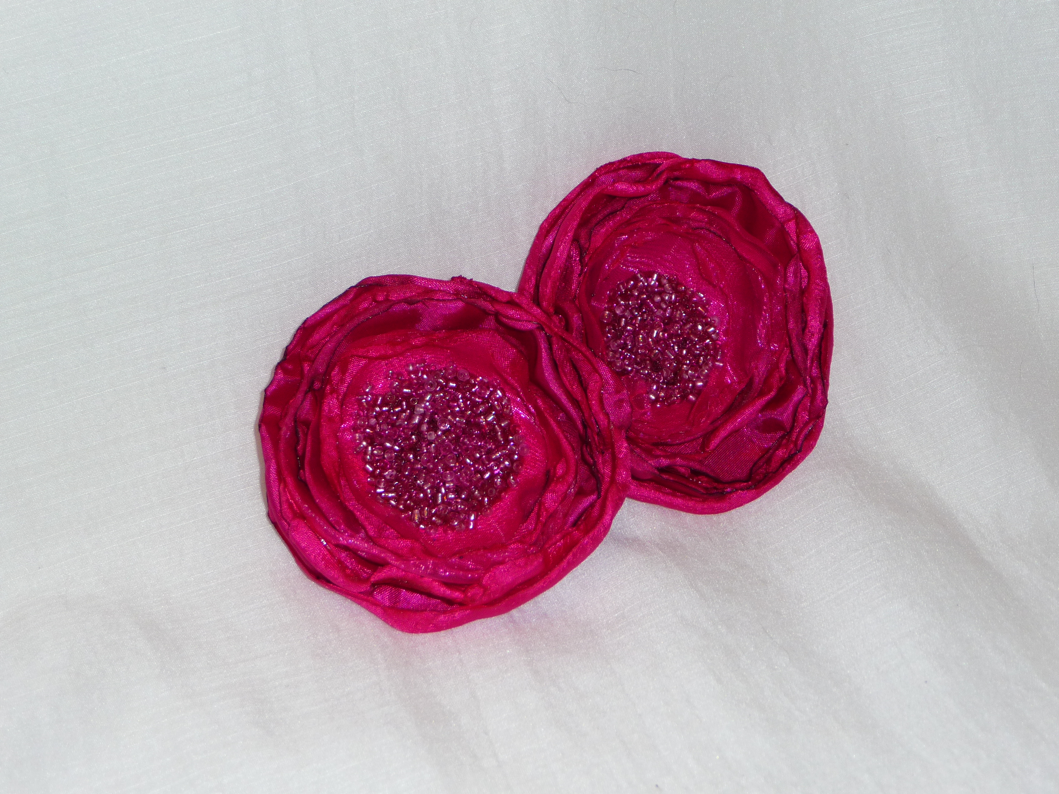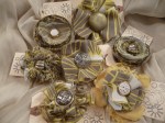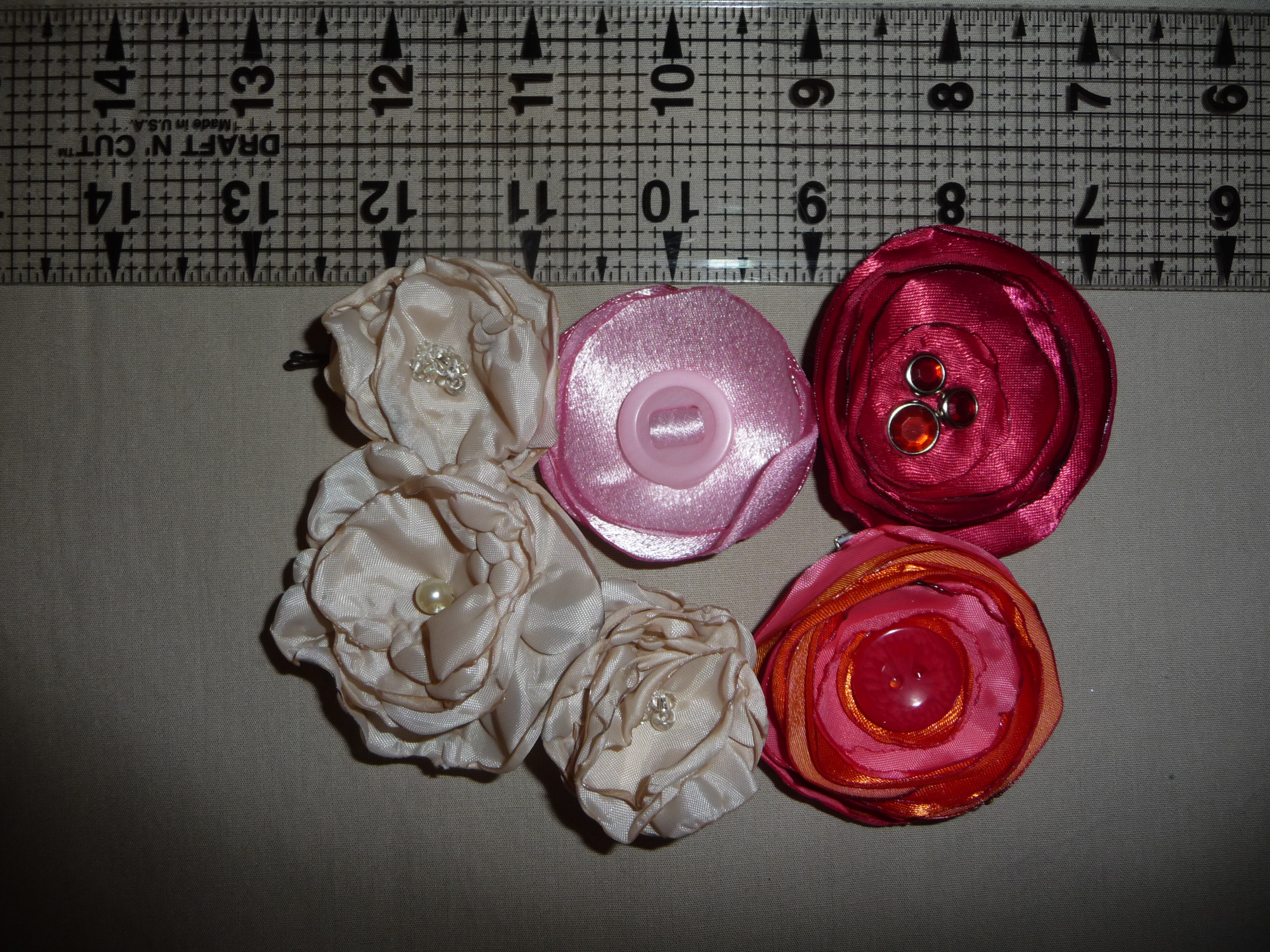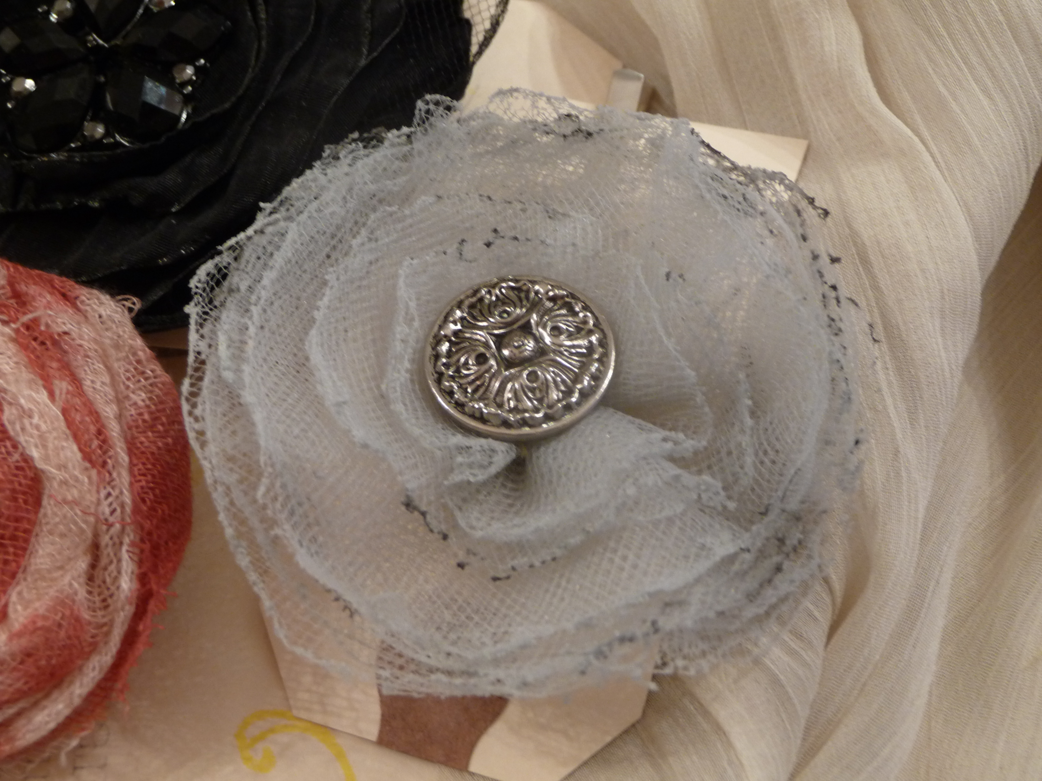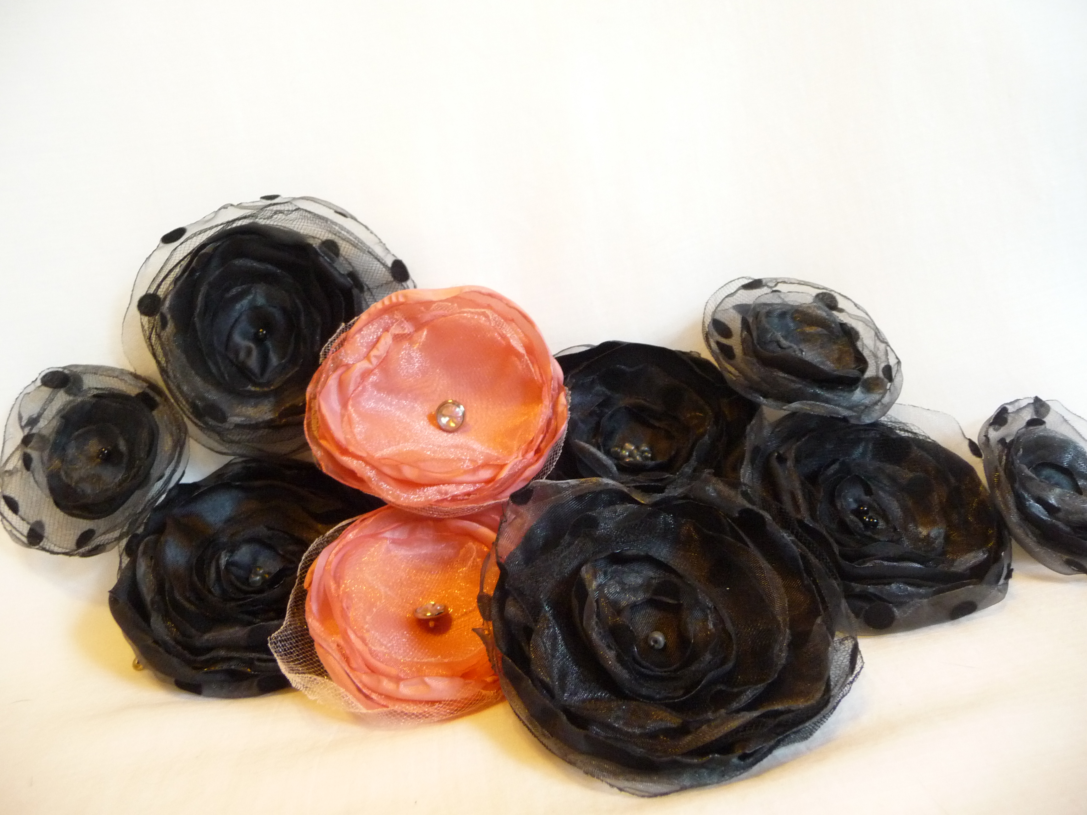 Fabric flowers created using many different fabrics and embellishments. Vintage jewelry, ribbons, feathers, buttons, felt and beads have been used.